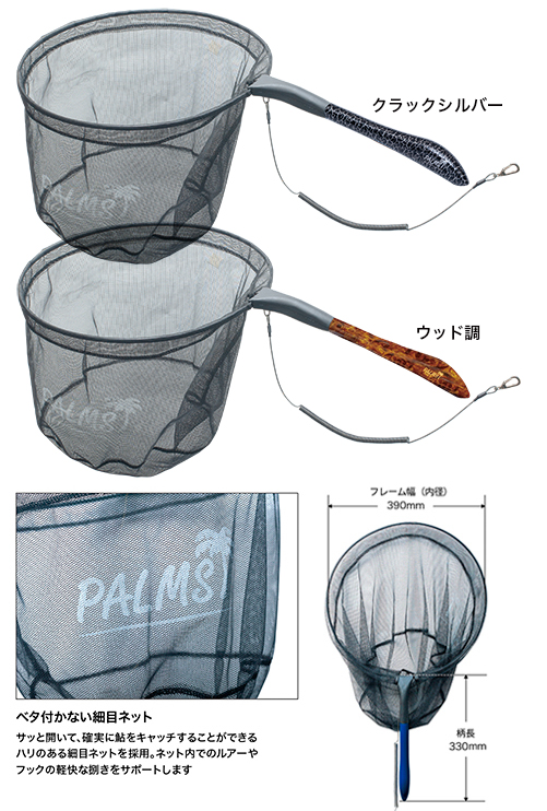 ルアーを使ってアユを狙うキャスティングアユゲームにおいて、ランディングツールは必須の装備です。パームスアユネットは、抜き上げた鮎を確実にキャッチするための大口径サイズのネットフレームを採用。ネット自体がベタ付くことなく、一振りで開口するため、アユの取りこぼしを最小限に抑えることを可能にします。さらに腰ベルトへの抜き差しをサポートする柄のデザインなど、川の中に立ち込んだ状態での使い勝手の良さは本格鮎ダモに匹敵するスペックです。