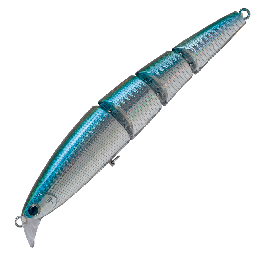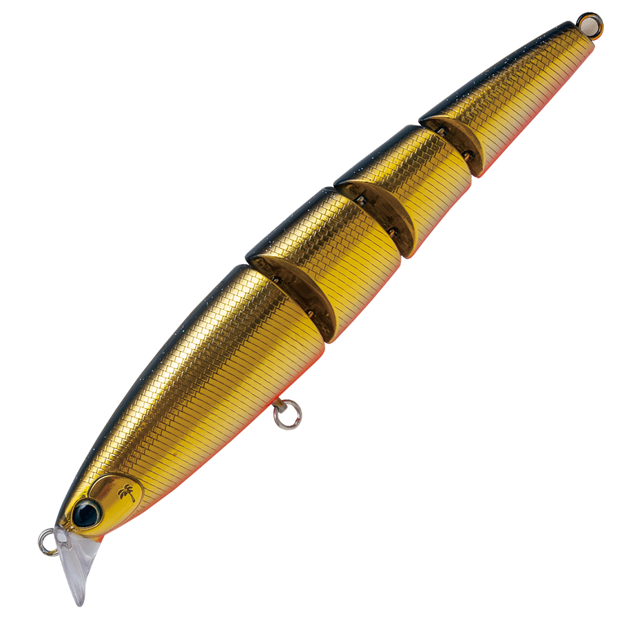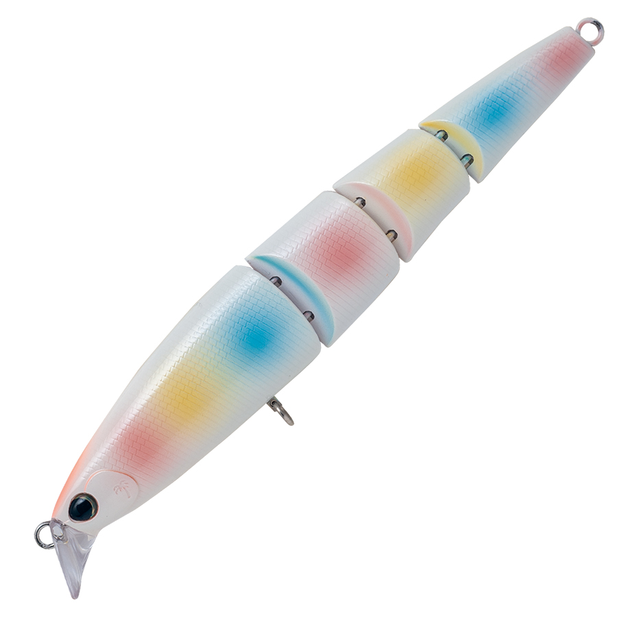 大型トラウト攻略に標準を合わせたマルチジョイントプラグ“JABAMI”「フラットタイプ」。 水によく絡み、ロッドアクションにも素直に反応、4pcジョイントプラグならではの滑らかなアクションはベイトフィッシュライクな泳ぎを忠実に再現しつつ、ワームでは出し得なかったプラグの面によるフラッシングも発生させます。タテ気味のリップは適度な引き抵抗を感じ、ミッドストリームから汽水域の緩流帯の攻略を容易にしスローリトリーブで独特の波動と振動を発生させてターゲットにアピールします。ジョイントプラグの難点であった飛距離もジョイント部のV形状を鋭角にし極端な曲がりを抑えることで、安定した飛距離を実現しました。リリースを前提としたトラウトゲームに於いて前後ともシングルフックを装着した仕様はトラウトへのダメージを確実に軽減します。また必要に応じてウエイトを貼ることによって、ボディバランスと深度を調整様々なシチュエーションに対応することができます。