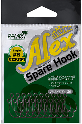 アレキサンドラ、ベアトリスに純正で装着しているシングルフックです。何匹もキャッチあるいはフッキングしていくとフックポイントは自然と甘くなっていくものです。川底の石やルアーとのコンタクトはもちろん、キャスト時に触れる木や枝、川岸に繁茂している葉でさえフックポイントを鈍らせる大きな要因となっています。少しのゲイブの開きがフッキングの甘さやバレを誘発していくのです。一日のなかでも何度もチェックし交換しなければならないフック、その頻度が釣果を左右します。トラウトに最も近いフックは重要なアイテムと言ってもいいでしょう。アクション、バランスを大きく左右するフック、純正品の安心感と性能を体感してください。