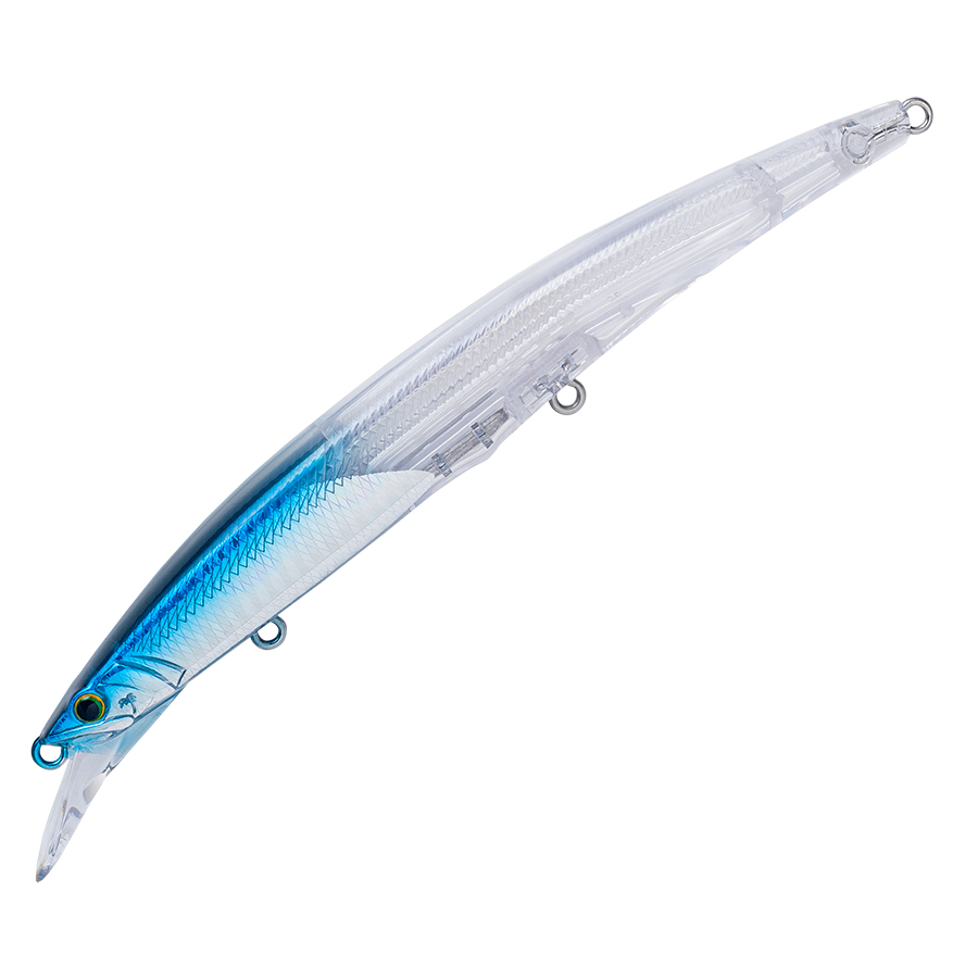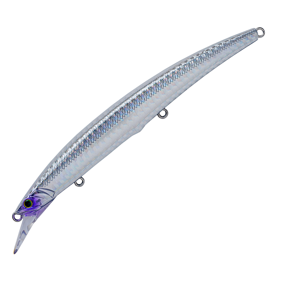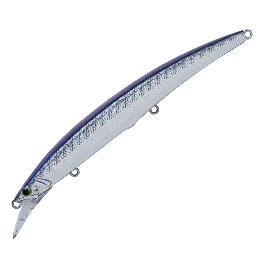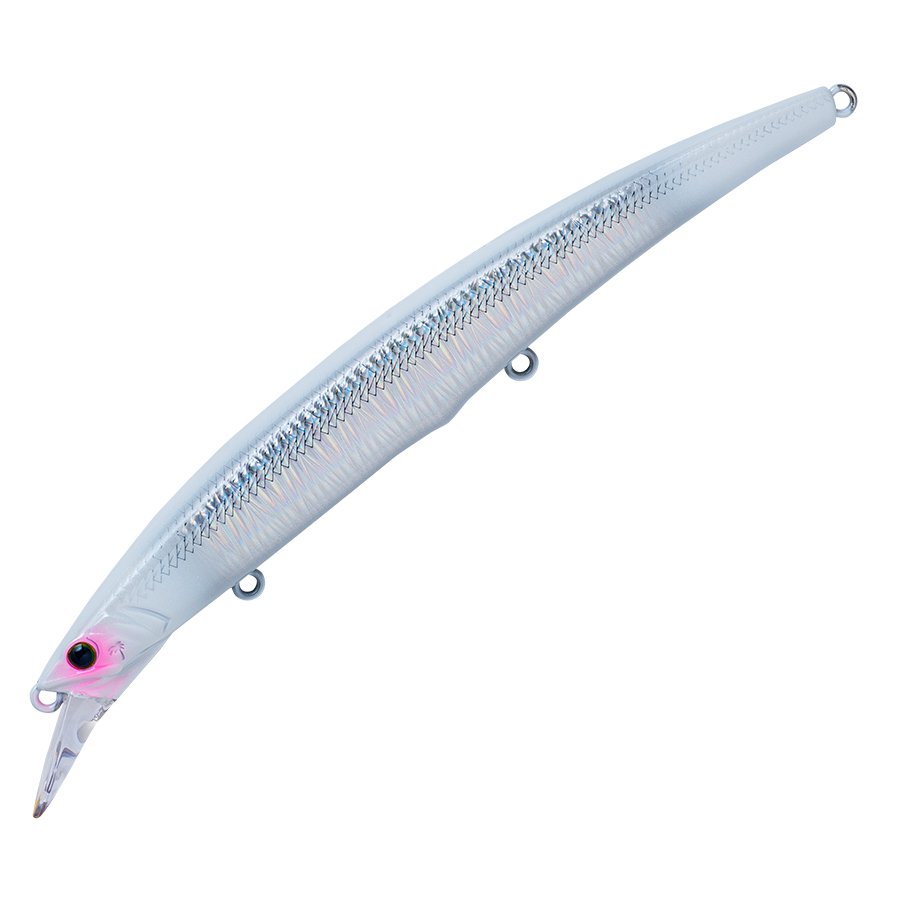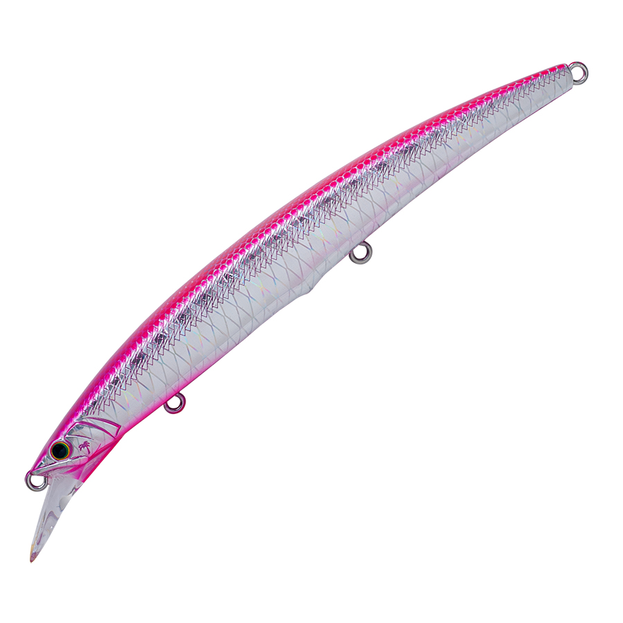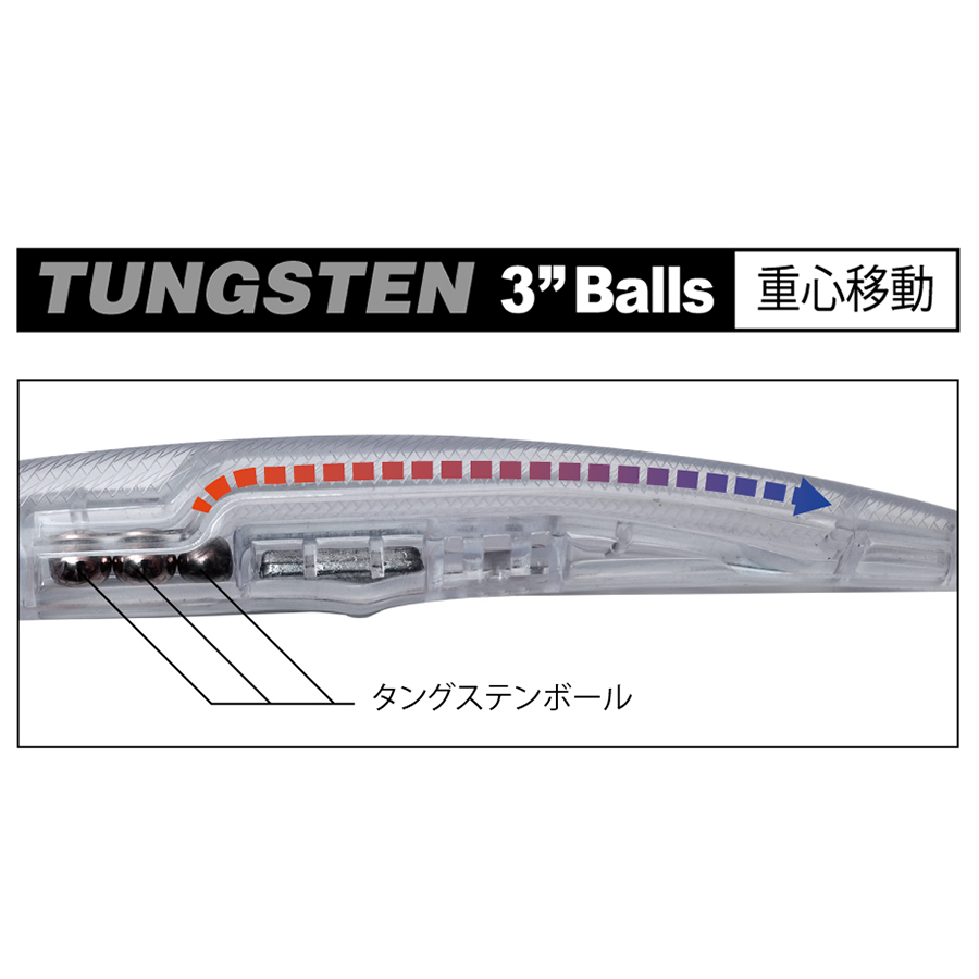 ジャークによる誘い出しでは、三次元に弧を描くダート&ヒラ打ちアクション。ただ巻きでは、ダイヤモンドリップが生み出すウォブンロールアクション。投げて良し、動かして良し、巻いて良し、掛けて良しのオリジナル性能はそのままに、3つのウエイトボールすべてをタングステン仕様とすることで自重増を実現したチューニングモデル。飛行中の姿勢がより安定する事で、飛距離アップに加え、荒天時の対応力や、速く正確なキャストが求められるナブラ撃ち攻略において優位性を発揮します。また、増した自重によってルアーを沈めやすくなり、オリジナルモデルより一枚下のレンジでもアピールが可能になりました。バランスの取れたオリジナルから派生した、一つの方向性。ピーキーな性能が魅力の進化系モデルです。