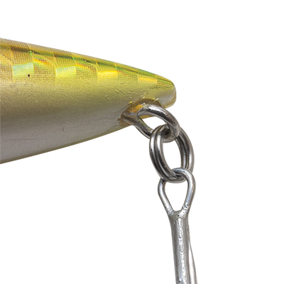 ロッドワークに対するレスポンス。ドッグウォークから微細な引き波アクションまでを華麗にこなす高浮力クイッキーアクションが身上です。アクションエラーを極力起こさないバランスは、多少ラフな水面であっても、意のままにターンを演出することが可能です。やや長めのジャークから生み出されるダイビングアクションは、水中でのワイドウォブルを伴います。最小限の移動距離内で最大限のアクションを生み出す性能は、ストラクチャーにタイトに着いたターゲットに対しても有効です。