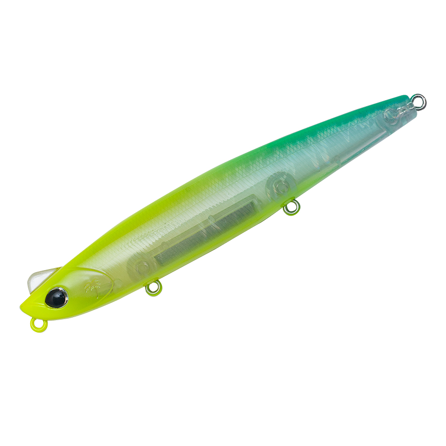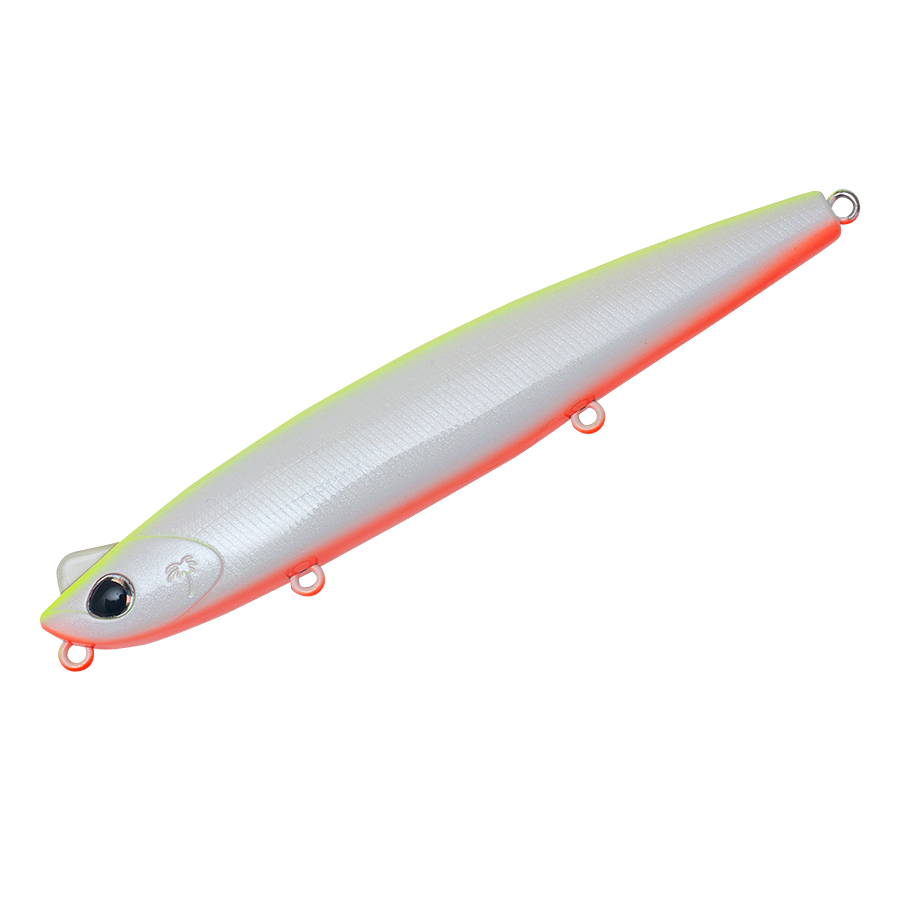 カレフ125が目指したのはトップウォータールアーと、フローティングミノーの間を埋めるシャローレンジ攻略。シンクレートを極限まで低く設定することで可能にする水面下一枚を攻めるS字スラロームアクションを生み出します。加えてわずかな潮流やロッドワークによるイレギュラーアクションは、オートマティックとも言えるバイト誘発アクションです。多くの実績を築いてきたカレフファミリーの中でも、シャローが絡むサーフや大型河川における使い勝手を追求したモデルは、さらに幅広いシーバスシーンでそのパフォーマンスを発揮します。