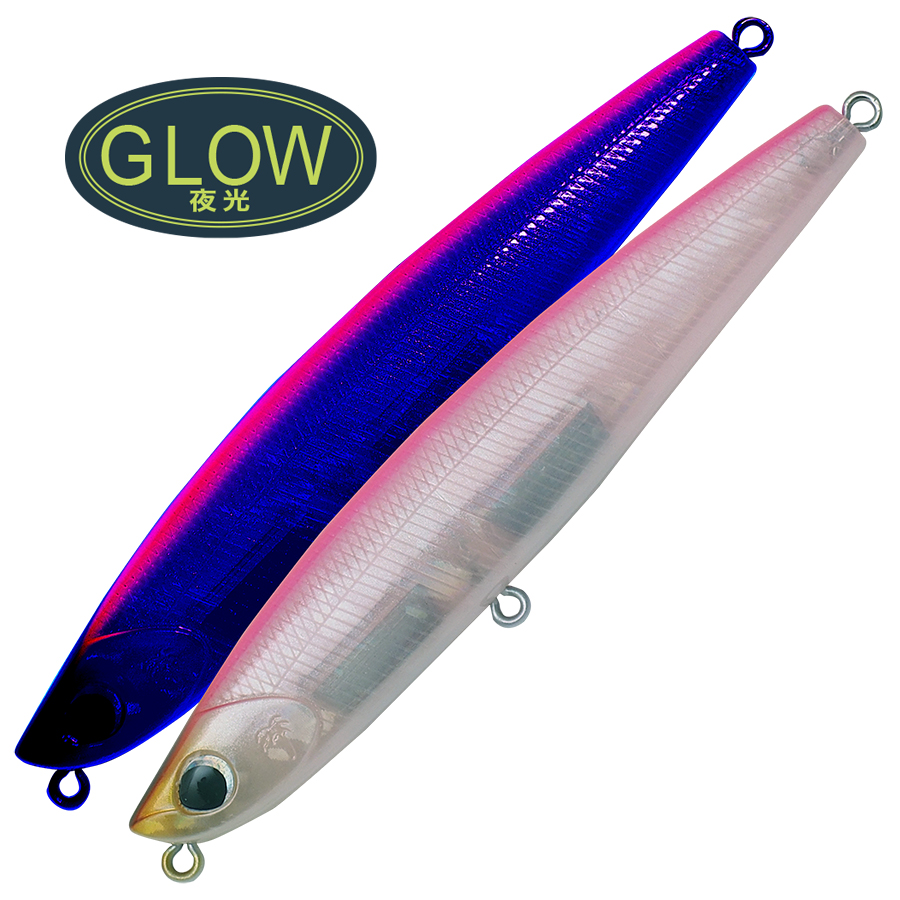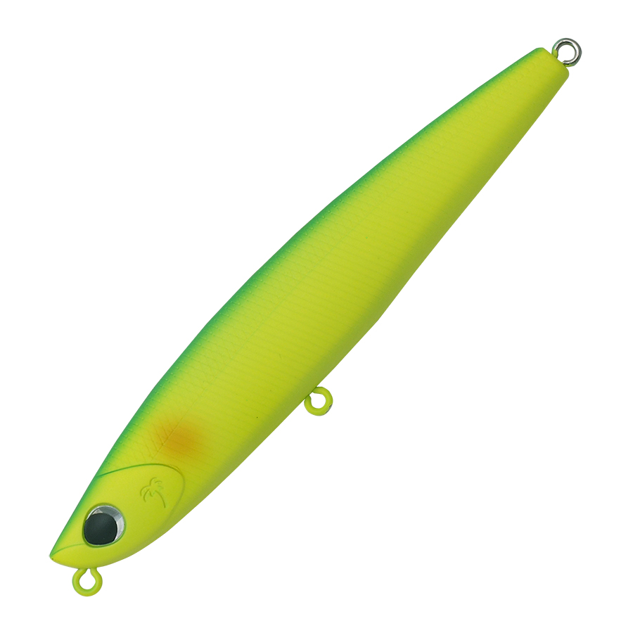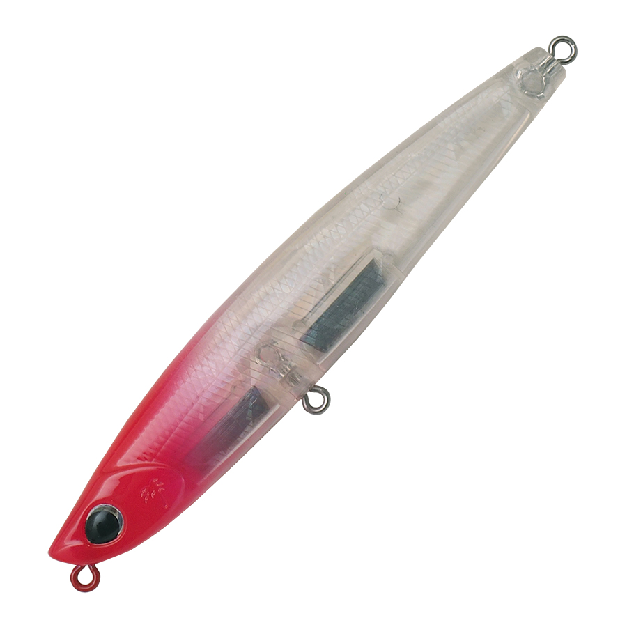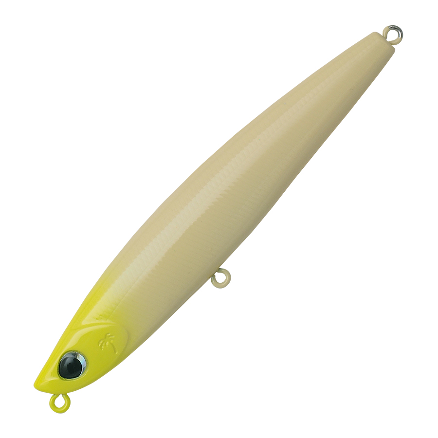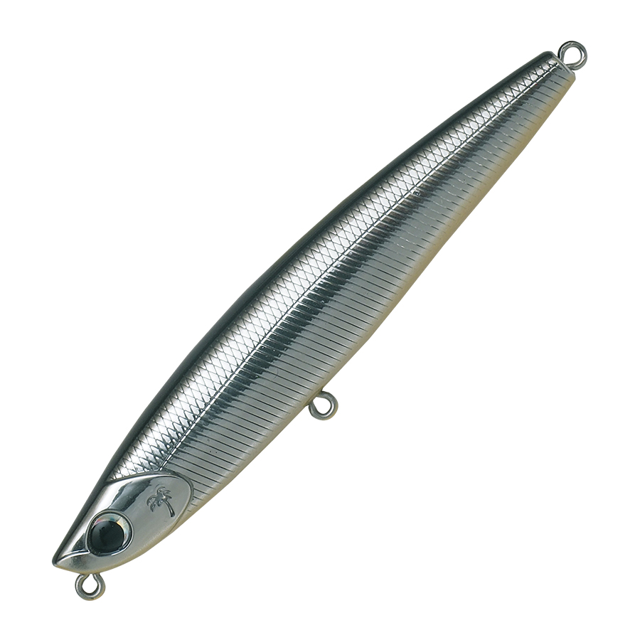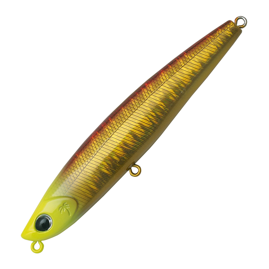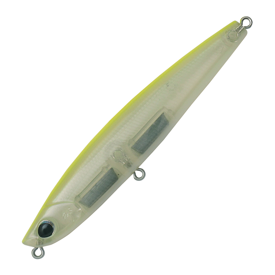 カレフ95が目指したのは、微波動〜ナチュラルスラロームによる喰わせるためのアクションを、いかに容易に引きだすかということ。低速ではボディを震わす微波動で誘い、スピードをあげるに従って水に絡むようなナチュラルスラロームへと変化。高いセンシティビティは水の流れに対してのイレギュラーアクションを誘発し、干潟のわずかな潮流の変化や、河口域のカレントで的確に喰わせの間を演出します。水平姿勢を維持したタイトロールを伴うフォールアクションと相まって、常にターゲットに捕食を意識させることが可能です。死角のない立ち上がりを発揮する固定重心でありながら、16gの自重により圧倒的な飛距離も実現しています。