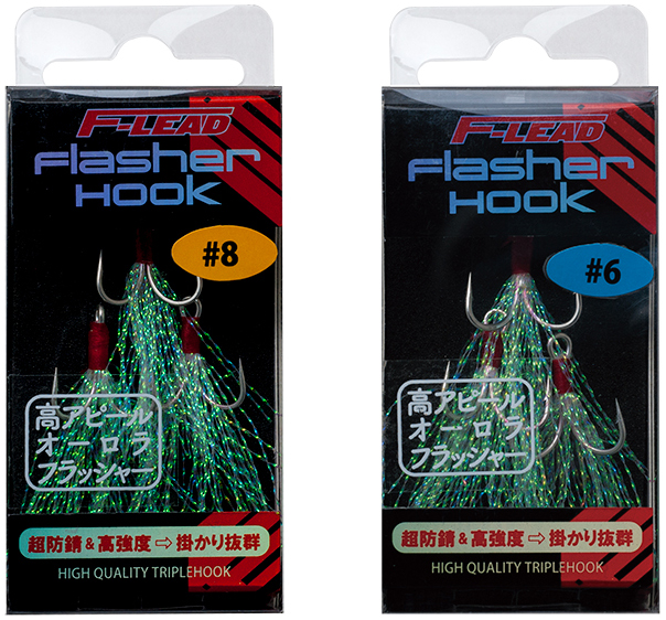 F-LEADシリーズ純正として装着されるこの“フラッシャーフック”は、オーロラの輝きとリーリングで左右に揺れるアクションでターゲットを魅了し、バイトマーカーとなる効果がフッキング率を向上させます。さらにはフォール時のスピードを抑える目的でも使用できるトリプルフックです。