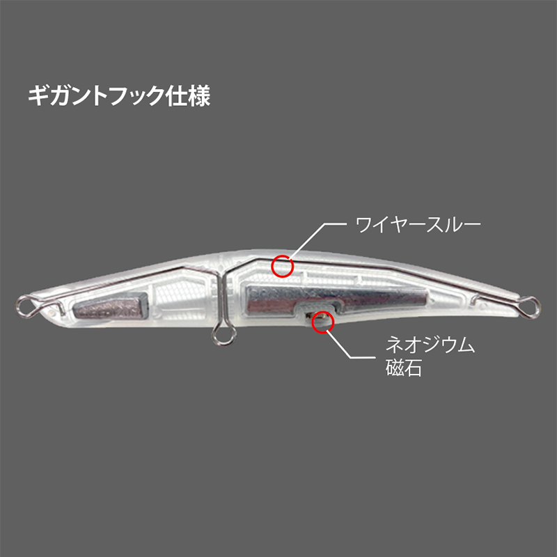 大型をターゲットにしたギグギガントフック。ミノーライクなシルエットをそのままにフックサイズを拡大したオフショア専用モデルです。オリジナルから大幅にサイズアップしたトレブルフックを搭載しました。異例とも言えるの大型フック搭載に伴い、ベリーフックがルアーの背中に掛かってしまうことを避けるためマグマウントシステムを装備しました。これにより磁力でフックを吸着することでフックをベリーにキープしトラブルを軽減します。さらには、飛距離、アクションを損なうことなく安心のファイトを可能にするワイヤースルーを施し強度アップ。ギグギガントフックでより大型ターゲットに挑んでください。