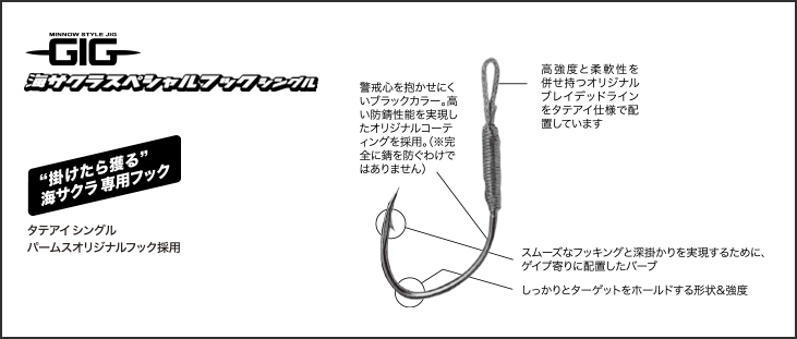 GIG海サクラスペシャルに標準搭載されてる純正シングルフックです。素早く深掛かりし、しっかりとターゲットをホールドする性能を両立するための“大鯵針”シェイプのパームスオリジナルフックを採用。バーブまでの軸径は細く、そして鋭くすることで、戯れるような海サクラのバイトを捉え、バーブ以降の中軸ワイヤは海サクラのファイトをしっかりとホールドする形状&パワーを備えます。オリジナルブレイデッドラインをタテアイで配した海サクラ専用フックです。