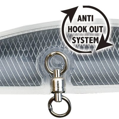 フロントアイ部分にローリングスイベルを内蔵することにより、ヒット時の急激な走り、反転や首振りなどバレにつながる要因をフックが回転することで軽減します。確実なキャッチに結びつける有効なフックシステムです。
