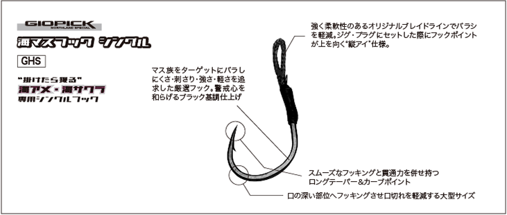 海マスゲーム用キャスティングジグGIO PICK(ジオピック)に搭載されている純正シングルフック。ショアからの海アメ・海サクラマスゲームでの一番の悩みは“バラシ”、それはマス族特有の口の弱さとヒット直後からランディング直前まで繰り返される激しいローリングファイトによるもの。このバラシを軽減するために開発されたのが“海マスフックシングル”です。ジグ・プラグのアクションを損なわない範囲でフックサイズを大型化し口の深い部位にフックを貫通させ口切れを回避、ホールド力抜群のフック形状と強く柔軟性のあるオリジナルブレイドフックアイが激しいローリングファイトに対応しバラシを軽減します。大海原での千載一遇のチャンスを確実な釣果へと導く大きな武器として、その実力をご実感ください。