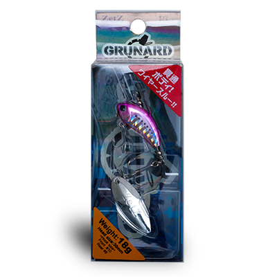 抜群の飛距離と高いフラッシングアピールを備え持つニューブレード系ルアー「グルナード」。ウエイトシンカーボディにワイヤーを貫通させることにより、ボディ自体がフリーに動くユニークな設計を施しました。ブレードの回転によるヨレや傾きをボディに影響されること無く、スムーズでストレスの少ないリーリングが可能です。また、ヘッド部のディンプルで水を受け、小刻みにバイブレーションさせることでボディ本体の波動とブレードのフラッシングの相乗効果を引き出しています。堤防やサーフではもちろん、ボートフィッシングにも有効で使用フィールドは無限大です。「グルナード」は身近な人気ターゲットのカマスやアジ、ロックフィッシュのハタやソイ、回遊魚の太刀魚や青物、サーフのシーバスやフラットフィッシュなどと多彩なターゲットを狙うことができるスピンテールウォブラーです。