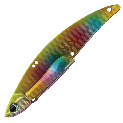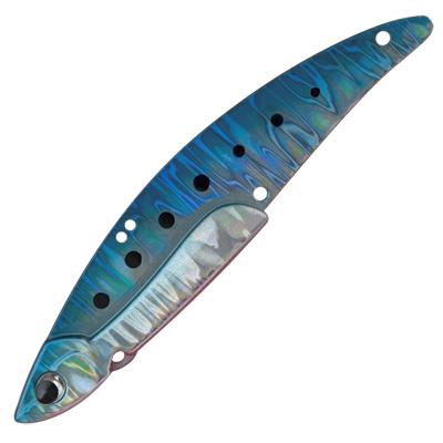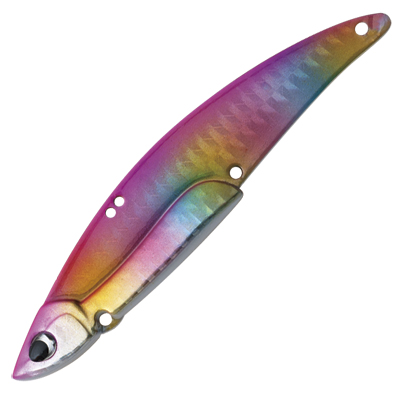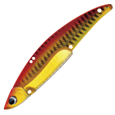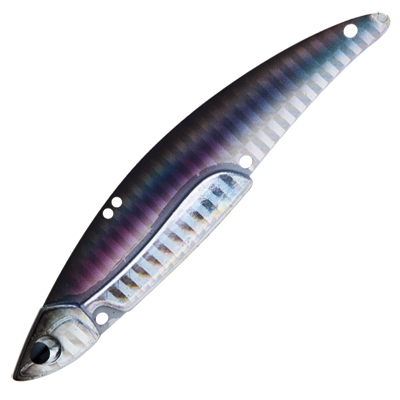 100ミリのショートボディに#6トリプルフックを3本装着した鉄板系バイブレーション。骨格をなす強靭なステンレスボディを小刻みに振るわせることで強烈な明滅フラッシングを生み出します。バランス良く配置したウエイトは抜群の飛距離を稼ぎだし、港湾、サーフ、オフショア等でより広範囲を攻略できます。2つのラインアイは、ポイントやターゲットによって使い分けることが可能です。前方のアイは、通常使用に最適なタイトローリングによるパッシングアピールが有効。引き抵抗も少なくリーリングスピードによる可変アクションが簡単にできます。後方のアイは、水をボディ全体で掴み、テールを大きく左右に振り激しくバイブレーションします。強烈なパッシングでターゲットを刺激、特にリフト&フォール時に効果的にアピールします。フックの装着位置はフック同士の絡みを低減するテールアイを採用。ヘビーウエイトバイブレーション特有のバレやすさを3フックにすることで大幅に軽減し、確実にヒットからキャッチへと導きます。また、先端まで入ったステンレスボディが摩耗を軽減する工夫など、随所にタフなコンディションでこそ威力を発揮する設計を施しています。