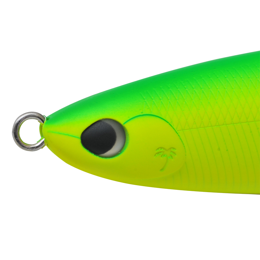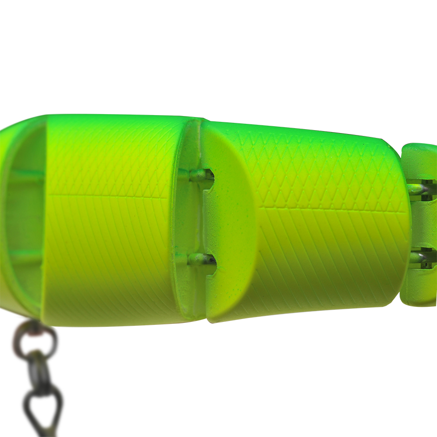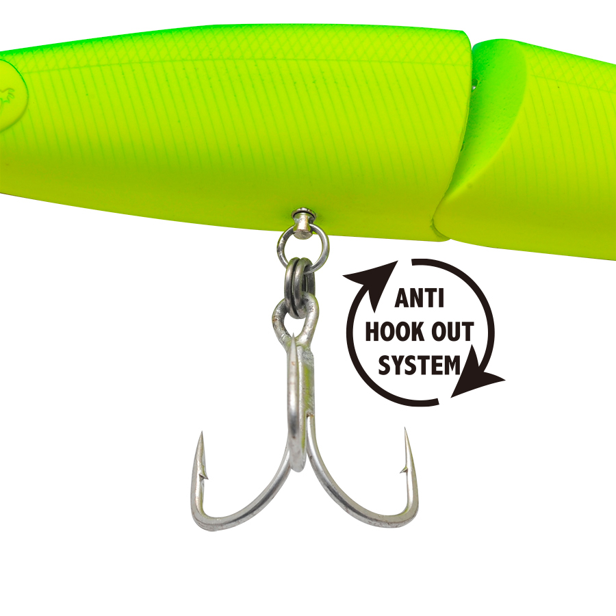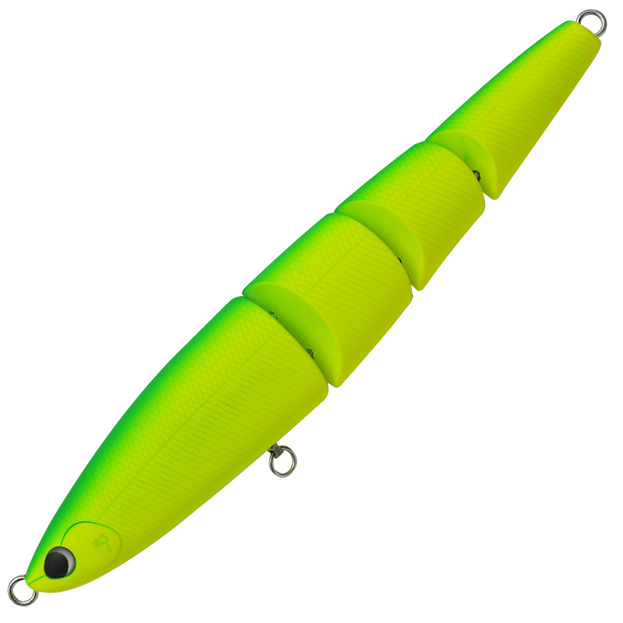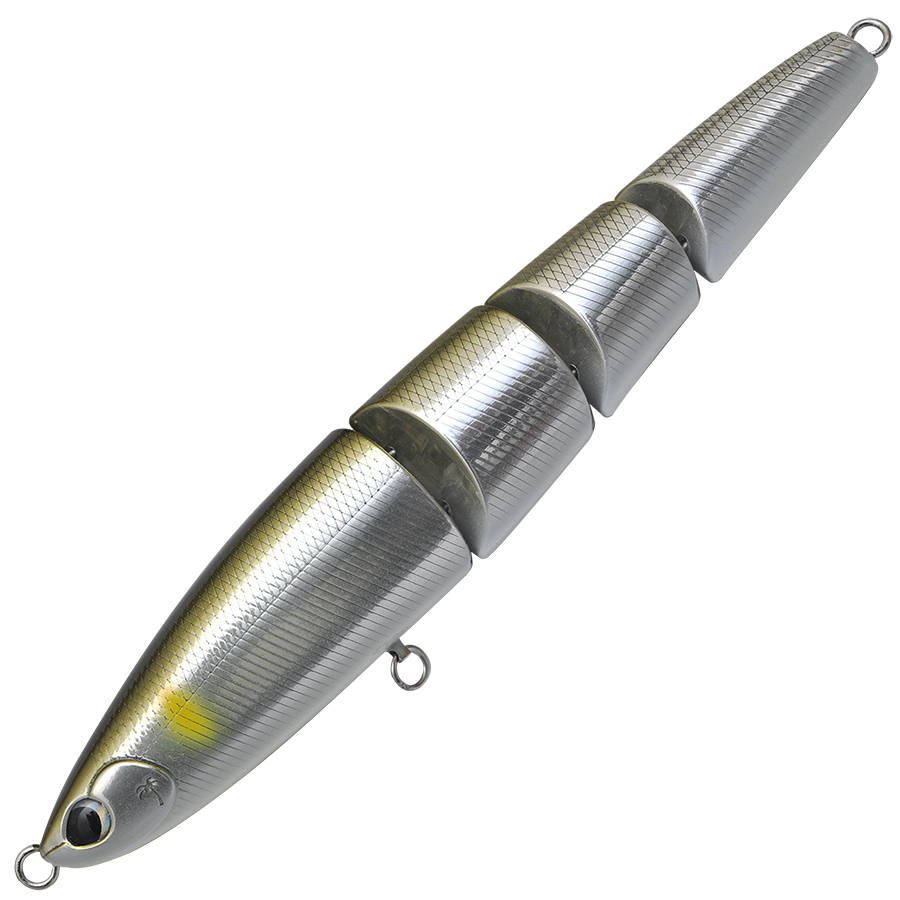 175mmボディのマルチジョイントが生み出すボリューミーかつ、艶かしい引き波。落鮎が絡むリバーゲームではドリフト気味のリトリーブでも航跡を残しつつ、わずかな水流によってジョイントならではのアクションがシーバスのバイトを誘発。さらにコノシロパターンでは引き波とフラッシングの相乗効果によって、下のレンジからターゲットのバイトを誘います。もちろんアユやコノシロ以外にも、ビッグベイトを捕食しているシーンにおいて、新たなアプローチを可能にします。あえてジョイント角を小さくデザインすることで、安定した飛行姿勢を目指しました。マルチジョイントの弱点を克服し、多くのフィールドでジャバミリップレスのパフォーマンスを体感していただける仕様です。