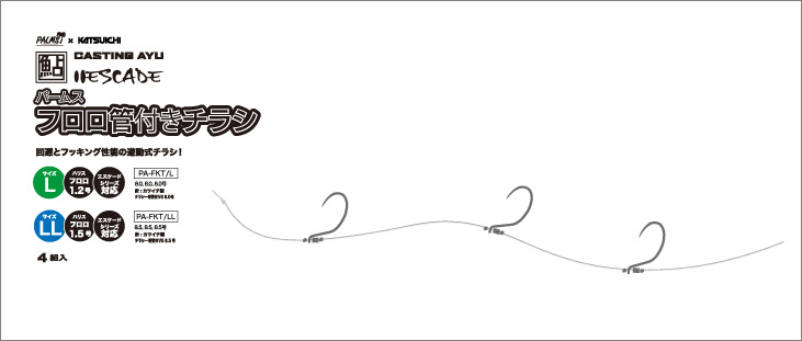 キャスティングアユ専用の管付チラシ針が登場。遊動式にすることで水中で安定して針が下を向き、ボトムでのスタック回避と鮎への背掛かり率をアップさせます。針は高い貫通性能を誇るチラシ一番管付きV5(カツイチ製)を使用し、幅広いシチュエーションで活躍する8.0号(L)とシーズン後半の大型個体にも対応できる8.5号(LL)をラインナップしました。ハリスは程よいハリ感と柔軟性を兼ね備えたフロロカーボンラインを使用しトラブルレスとバラしにくさを体感できます。
