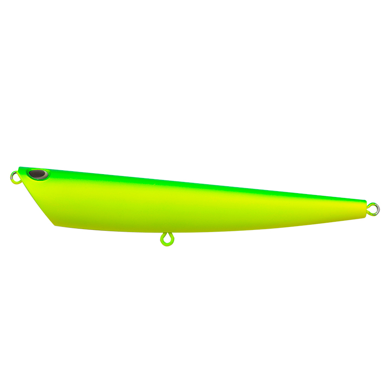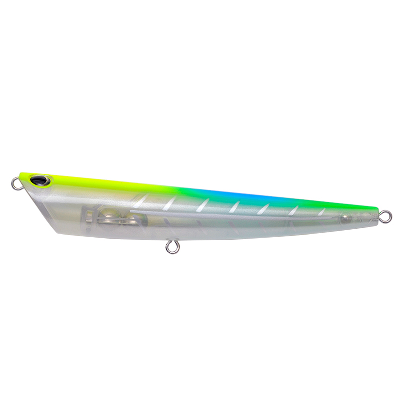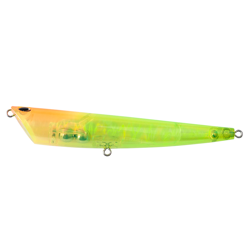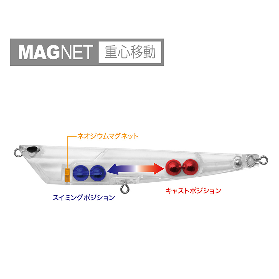 スプラッシャーは湘南で生まれ、そして多くの実績を築いたシーバスルアーの王道とも呼べるモデルです。そのスプラッシャーが生まれ変わります。外観はオリジナルモデルのシェイプを再現。もはやシーバス用トップとして不動のアウトラインとなっているこの部分には、あえて手を入れません。肝はスイムアクションで“泳ぎすぎないこと”。その上でいかに魅力的な引き波を出すかが課せられたテーマです。平水時のスローリトリーブではルアー自体がアクションすることなく、バランスの良い水押しと引き波によるアピールを獲得しました。さらにミスバイトを未然に防ぐため、浮力はぎりぎりに設定しました。また使いやすさを左右する飛距離も見逃せない点です。マグネット固定による移動重心方式を採用し、フローティングでありながらクラスレベルの圧倒的な距離を誇ります。規模の大きいエリアで使うほどにそのメリットは実感されるはずです。