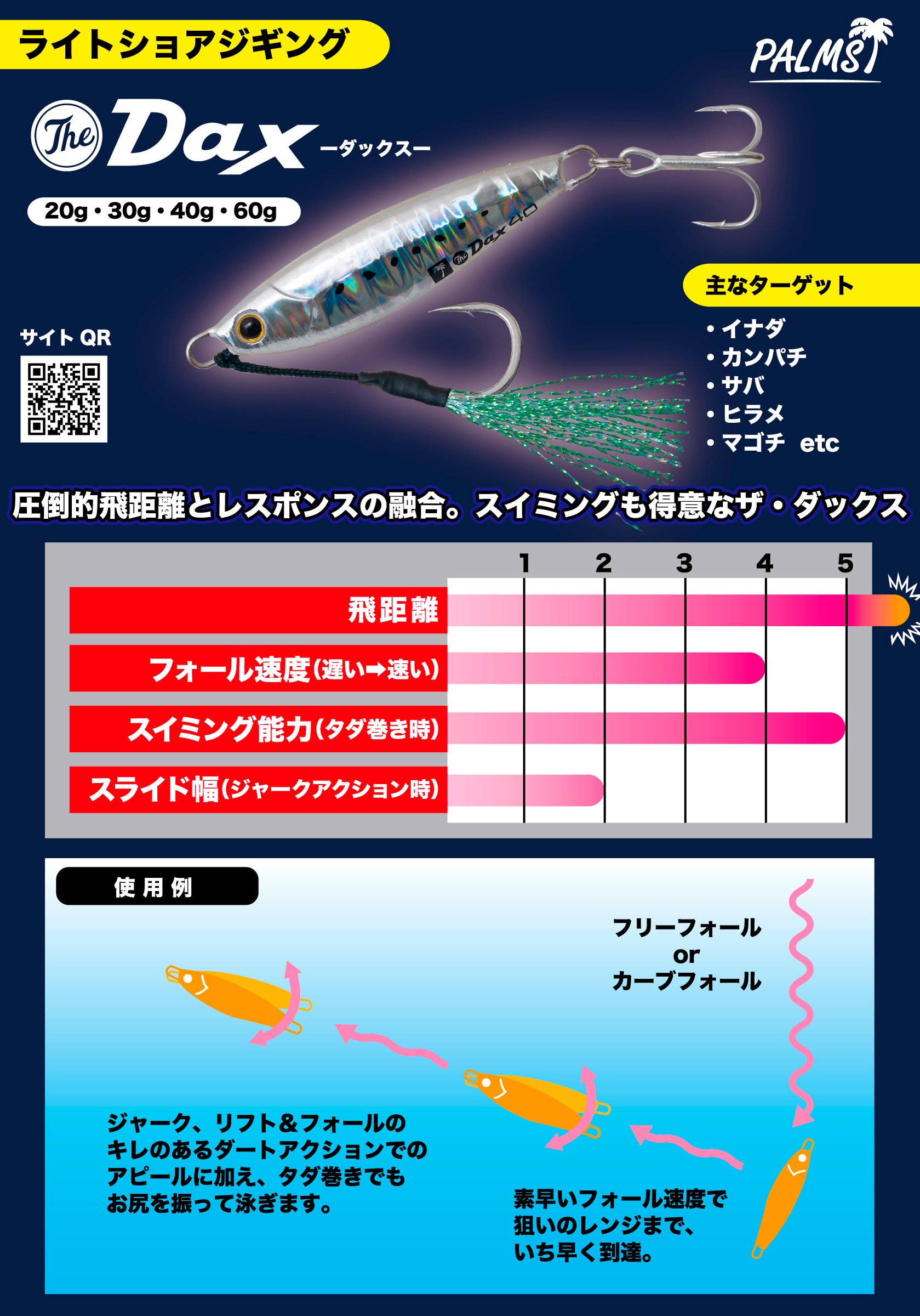 数々の実績とともに、多くのアングラーに支持されてきたスメルトダックスが2018年、ザ・ダックスとして生まれ変わります。高飛距離を生み出すコンパクトボディながら、ロッドワークに追従する高レスポンスを発揮。タダ巻きで発揮される大きなスイムアクションとともに、多彩なターゲットに対してバイトを誘発します。フェイス、テール、サイドエッジのすべてをシャープにデザインすることで、アクション発生時のフラッシングはもとより、安定の飛行姿勢にまで磨きを掛けました。高シンクレートがもたらす潮流攻略性能といった、ライトショアジギングにおける使いやすさを徹底的に追究したモデルです。