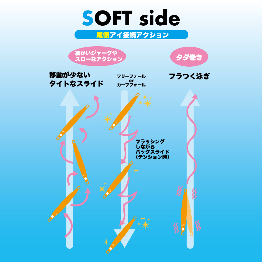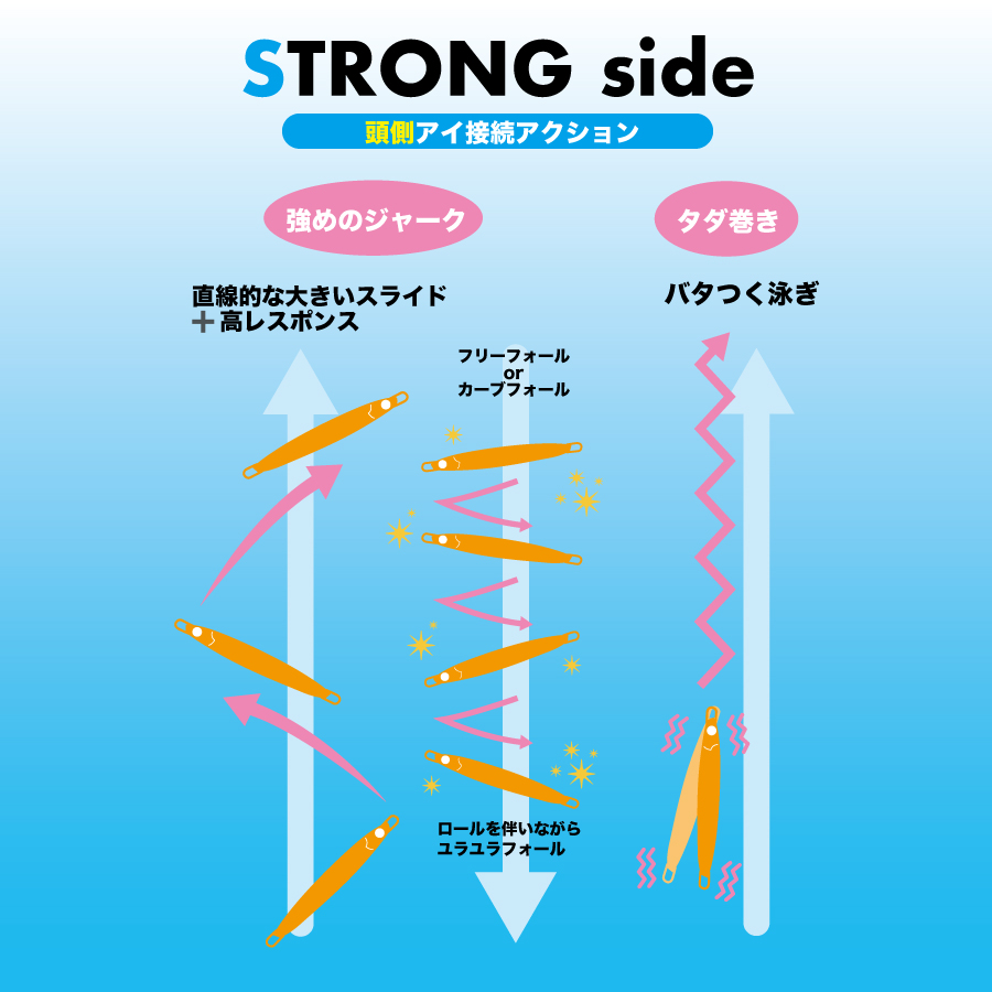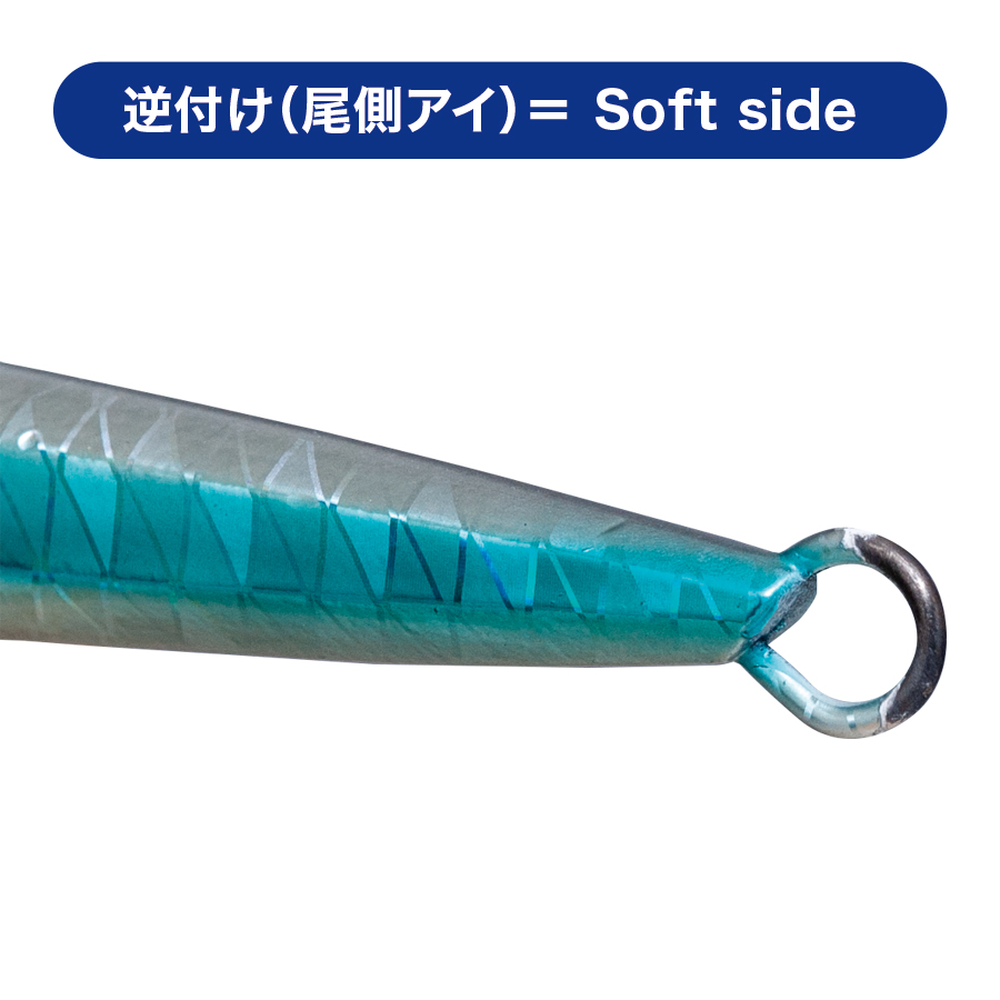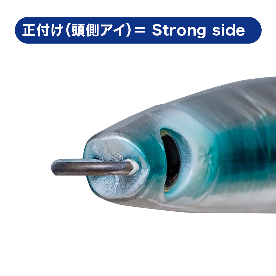 重心はセンターよりわずかに前方(頭側)に設定し、頭部と尾部で異なる水受け面積を持つことで、接続するアイの位置を付け変えるだけで“2つの性格”を引き出す事が可能です。強さや速さを演出しやすい正付け頭側アイの[Strong side]、弱さや遅さを演出しやすい逆付け尾側アイの[Soft side]。