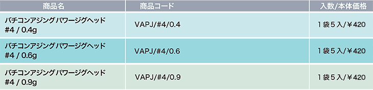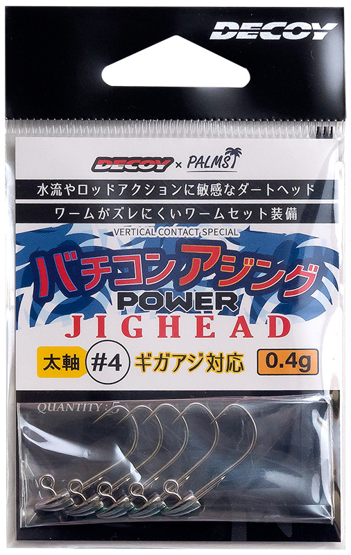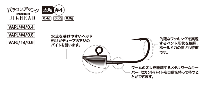 大型アジを狙うバーチカルコンタクトゲーム、通称“バチコン”に特化した高強度ジグヘッド。フッキング時の貫通性能の高さと強度をバランスさせたワイヤーを採用しすることで、ギガアジクラスにも安心してファイトすることが可能です。メタルワームキーパーは確実に小型ワームをホールド。深場でのワームのズレを軽減することで、効率良くアジのバイトを捉えます。水流を的確に捉えるヘッド形状は、シンカーを介した状態でも意のままのフォールアクションを発揮します。